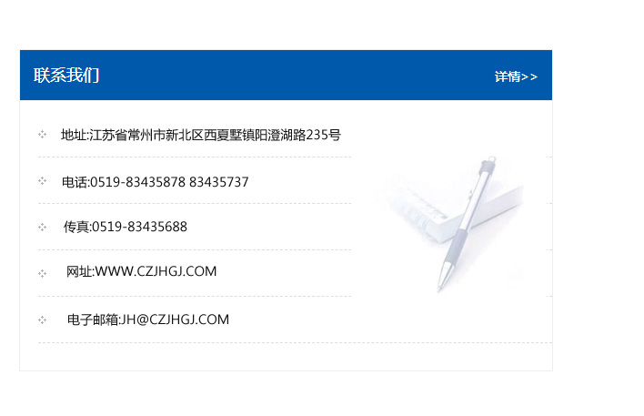 地址:常州市新北區友邦商務大廈1幢16、17層  電話:0519-85101652  傳真:0519-85112595  郵編:213022  網址:www.cz-jiayue_cn.szbaihenghui.com  郵箱:xiajifengaa@163.com